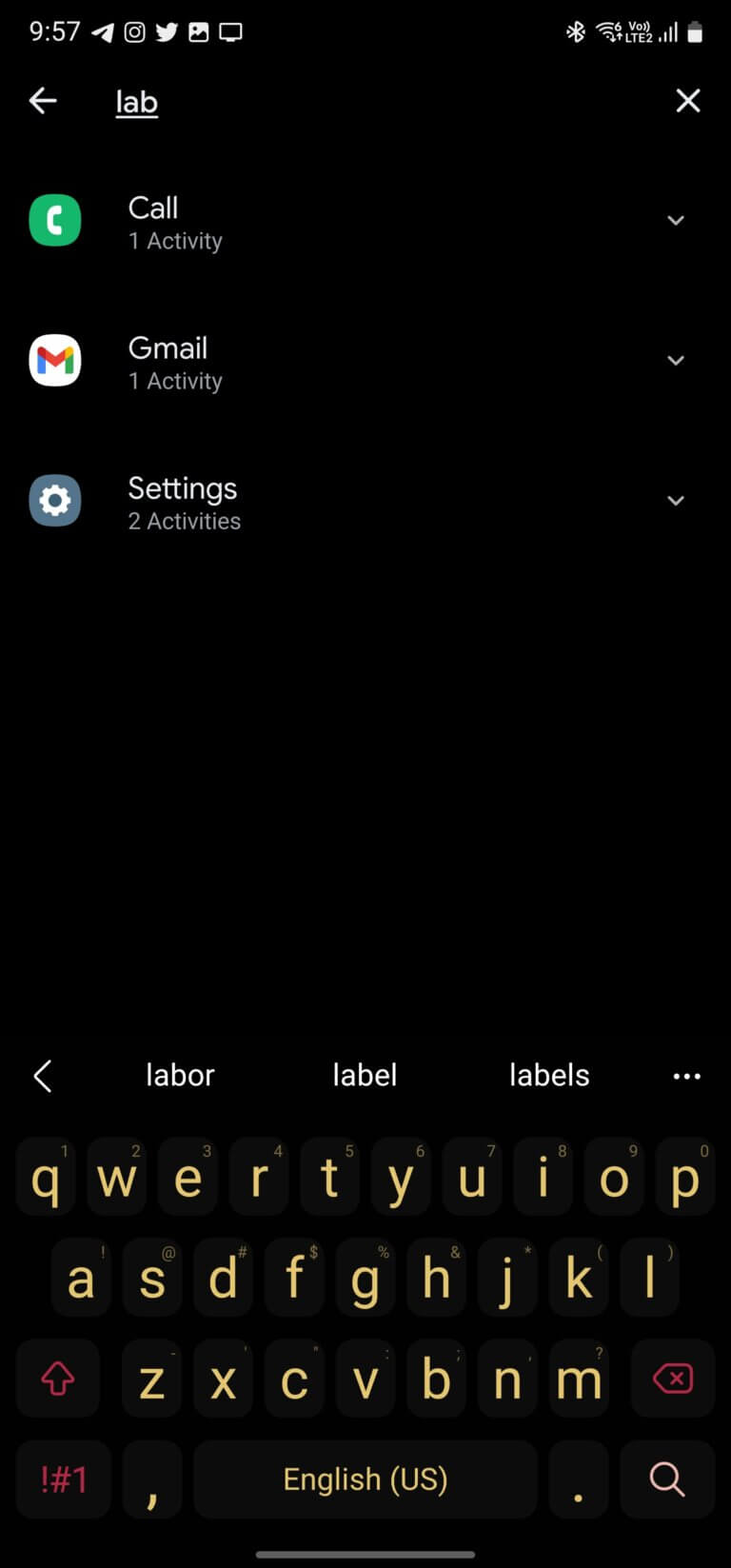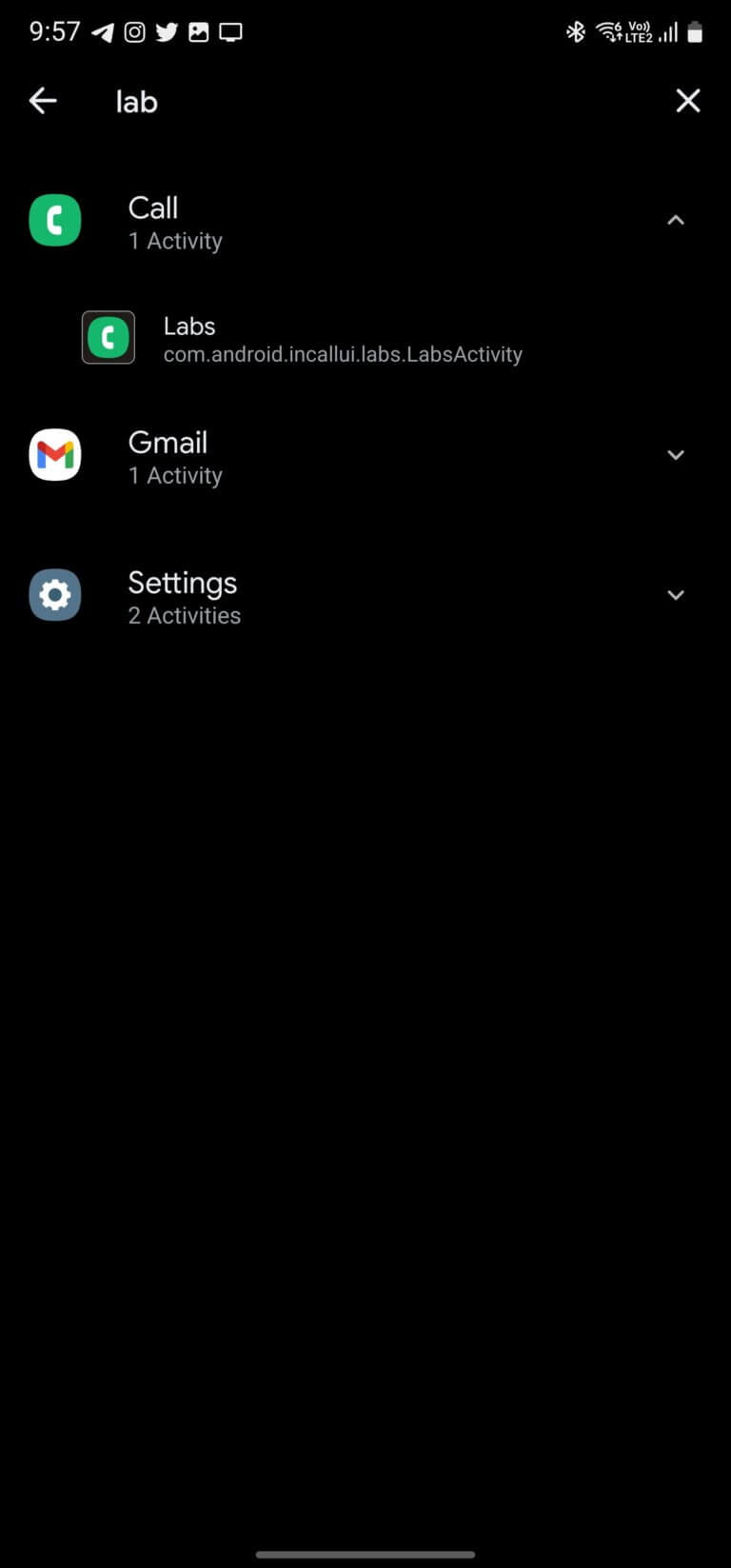 - You will see the top result being shown as the call app tap on the down arrow from the right and click on the Labs (com.android.incallui.labs.labsactivity)